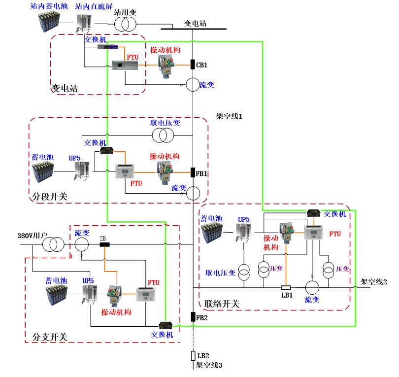 主干線分段開關(guān)設(shè)備配置:FTU、以太網(wǎng)交換機(jī)、斷路器及操動機(jī)構(gòu)、流變、取電壓變、蓄電池組、電源管理模塊;