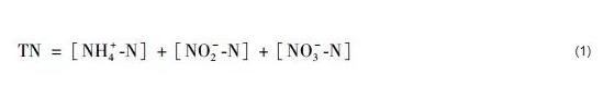 氨氮采用納氏試劑分光光度法;亞硝酸鹽采用N-1-萘基-乙二胺光度法;硝酸鹽采用紫外分光光度法[16];VSS采用重量法測定;pH值的測定采用玻璃電極法.總氮采用式(1)進(jìn)行計算: