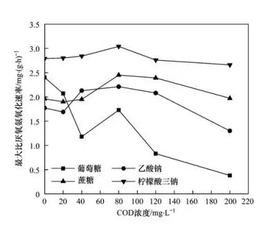 實驗進(jìn)水NH4+-N和NO2--N濃度分別為80 mg˙L-1和120 mg˙L-1.考察4種有機(jī)物葡萄糖、蔗糖、乙酸鈉、檸檬酸三鈉在COD濃度梯度0、20、40、80、120、200 mg˙L-1時對厭氧氨氧化反應(yīng)的影響.