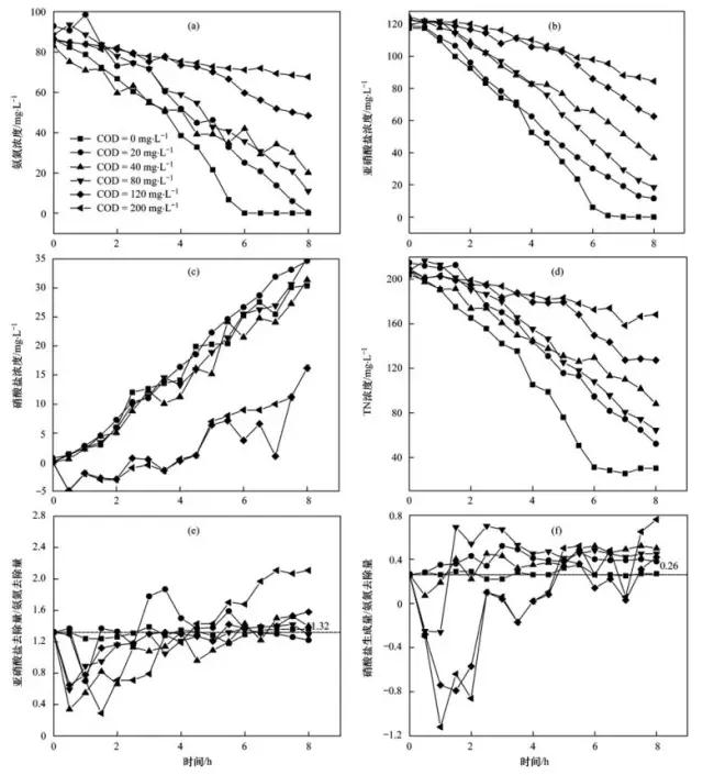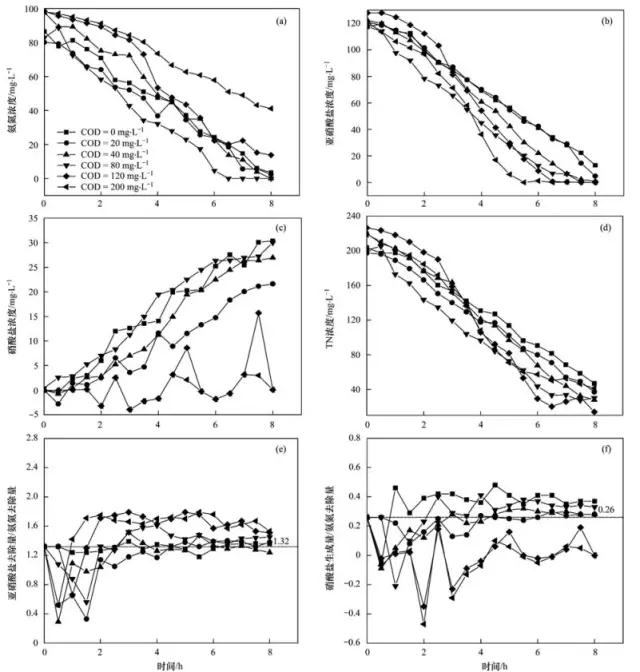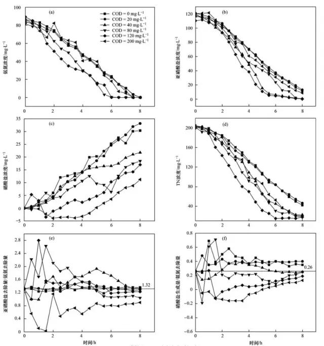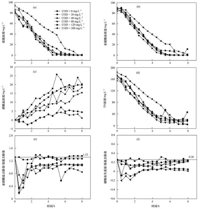 從圖 6(e)、6(f)中可以看出當(dāng)蔗糖濃度大于40 mg˙L-1時,NO2--N與NH4+-N去除量的比值先升高后降低最后接近理論值,而NO3--N生成量與NH4+-N去除量的比值正好相反先降低后升高然后逐漸接近于理論值,而且NO2--N與NH4+-N的比值先升高或NO3--N與NH4+-N的比值先降低的過程隨著蔗糖濃度的升高逐漸變短.這一過程與之前葡萄糖和乙酸鈉不同,可能是因為蔗糖更容易被反硝化菌代謝.隨著反應(yīng)的進(jìn)行,系統(tǒng)中有機(jī)物被消耗,反硝化作用受到抑制,NO2--N去除量/NH4+-N去除量與NO3--N產(chǎn)生量/NH4+-N去除量的值逐漸接近理論值.