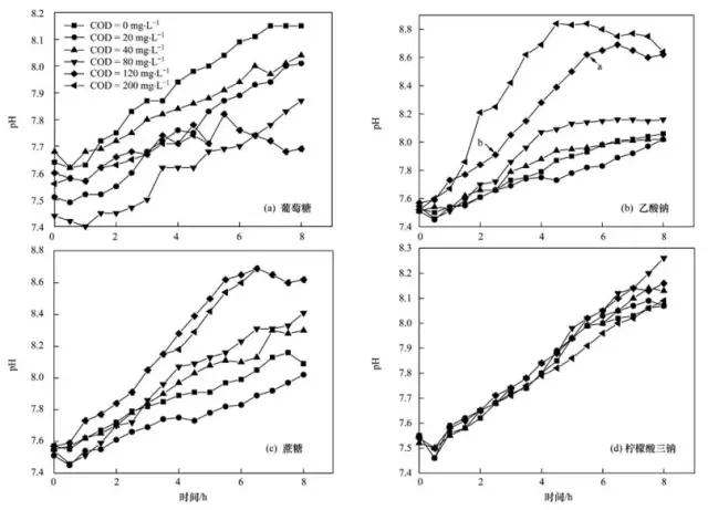 2.4 有機(jī)碳源作用下厭氧氨氧化系統(tǒng)pH的變化