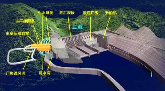 我國的四川省宜賓縣金沙江下游建設(shè)的向家壩水電站采用實體重力壩,最大壩高161米,壩頂長937.5米。水電站除了在靠左岸建設(shè)壩后廠房外,在右岸山體內(nèi)開挖了地下廠房。地下廠房由主廠房洞室與主變壓器洞室組成,4條引水隧洞從上游岸邊連通廠房4臺水輪機,4條尾水隧洞并為2條后通往下游江邊,除此還有進廠交通洞、通風(fēng)洞、排水洞、出線洞、母線洞、安全兼施工洞等。