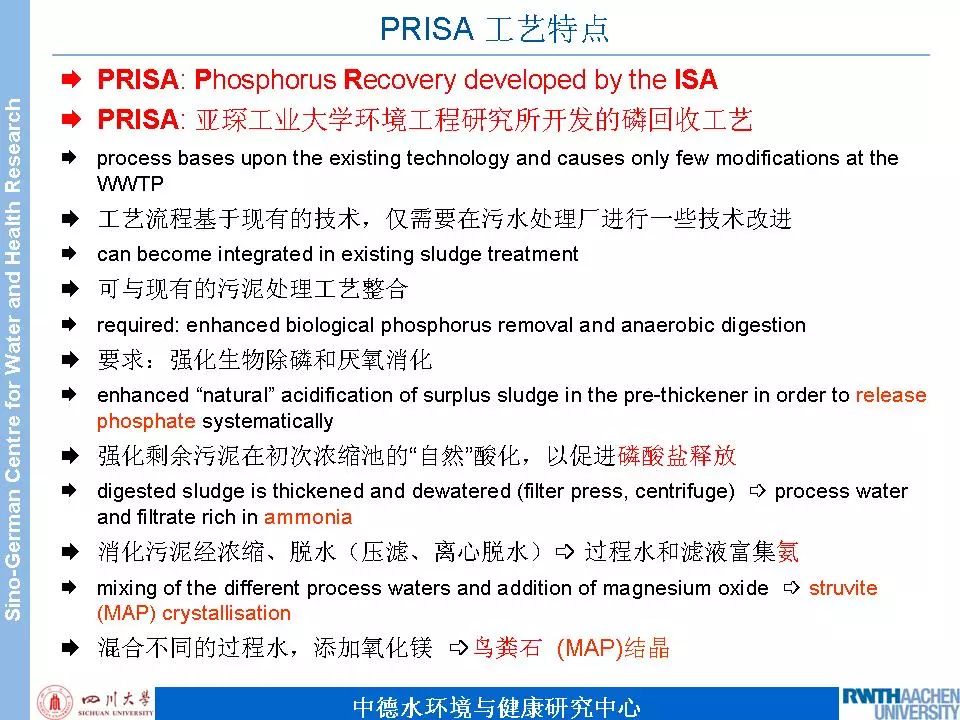 PRISA工藝是從污泥處理過(guò)程中產(chǎn)生的工藝水中回收磷(一次濃縮池上清液、厭氧消化池上清液、二次濃縮池上清液)。這三種工藝水中含磷的形態(tài)不一樣。經(jīng)過(guò)一定的化學(xué)處理之后,回收到是大家都非常熟悉的MAP。該回收工藝基于現(xiàn)有的污水處理工藝,僅需要在污水處理廠進(jìn)行一些技術(shù)改進(jìn),與現(xiàn)有的污泥處理工藝整合。該回收工藝對(duì)污水處理工藝要求,必須采用強(qiáng)化生物除磷工藝,否則污泥處理過(guò)程的工藝水中的磷的含量就比較低,就不太適合PRISA回收工藝。磷回收率要大于50%,滿(mǎn)足德國(guó)新"污泥條例"對(duì)于磷回收率的要求。
