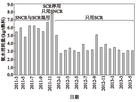 圖6SNCR以及SCR還原劑氨水用量的月平均比較