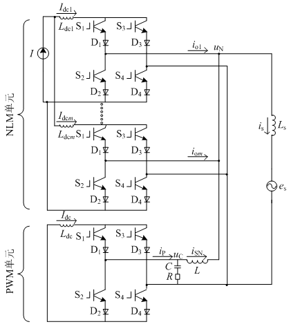 圖1中:I為變流器NLM單元直流側(cè)電流源電流;IdcmIdcm(m為正整數(shù))為NLM單元子模塊直流側(cè)電流;iomiom為NLM單元子模塊輸出電流;IdcIdc為PWM單元直流側(cè)電流;iPiP為PWM單元交流側(cè)輸出電流;iSNiSN為PWM單元輸出補(bǔ)償電流;iSiS為網(wǎng)側(cè)電流;eSeS為電網(wǎng)電壓;uNuN為交流側(cè)公共連接點電壓;uCuC為PWM單元交流側(cè)電容電壓;LdcmLdcm為NLM單元直流