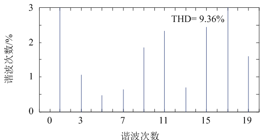 圖11(a)為NLM單元與PWM單元的輸出電流疊加后總的輸出電流波形,可以看出,NLM+PWM單元總的輸出電流與正弦波的擬合度更高。從其諧波頻譜分析圖(圖11(b))可知,各次諧波都有減小,其總的THD=2.73%,與單純的階梯波輸出相比其諧波畸變率得到了明顯改善。