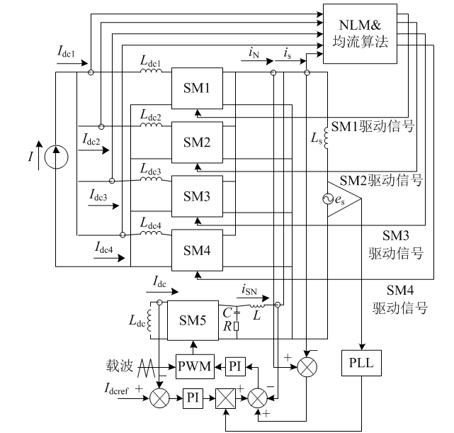 為采用最近電平調(diào)制的低頻子模塊,各低頻子模塊的分流電感電流和網(wǎng)側(cè)電流經(jīng)過NLM調(diào)制和均流控制確定各子模塊的工作狀態(tài);SM5為采用PWM調(diào)制的高頻子模塊,其通過雙閉環(huán)的直接電流控制策略確定工作狀態(tài);2部分協(xié)調(diào)控制,達(dá)到降低諧波畸變率和減小開關(guān)損耗的效果。