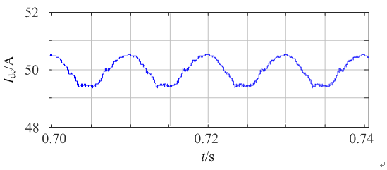 圖14為PWM單元直流側(cè)的電感電流波形,經(jīng)電流外環(huán)PI控制后,直流側(cè)電流在50 A周圍上下波動,基本穩(wěn)定在了50 A,確保了裝置的可靠運行并平穩(wěn)地輸出諧波補(bǔ)償電流。