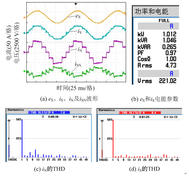 圖15(a)從上至下依次為系統(tǒng)網(wǎng)側(cè)電壓eS、NLM單元和PWM單元輸出電流疊加后的網(wǎng)側(cè)電流iS、NLM單元輸出電流iN和PWM單元輸出的補(bǔ)償波形iSN。圖15(b)為網(wǎng)側(cè)電能參數(shù),功率因數(shù)為0.97,基本實現(xiàn)了單位功率因數(shù)。圖15(c)為iN的THD,由于實驗只采用2個H橋級聯(lián)的NLM單元,其THD較大,達(dá)到了16.5%。圖15(d)為iS的THD圖,經(jīng)過PWM單元的諧波補(bǔ)償作用,不僅使iS實現(xiàn)了正弦化,而且THD降為10.7%,效果顯著。