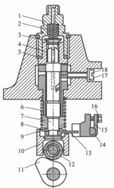 ①進油過程:當(dāng)噴油泵凸輪軸由曲軸驅(qū)動旋轉(zhuǎn)時,如果凸輪的凸起部分尚未與滾輪相接觸,柱塞則在柱塞彈簧8的作用下處于最下端位置。這時柴油從低壓油腔經(jīng)進油孔流入柱塞上方的柱塞套簡內(nèi)。